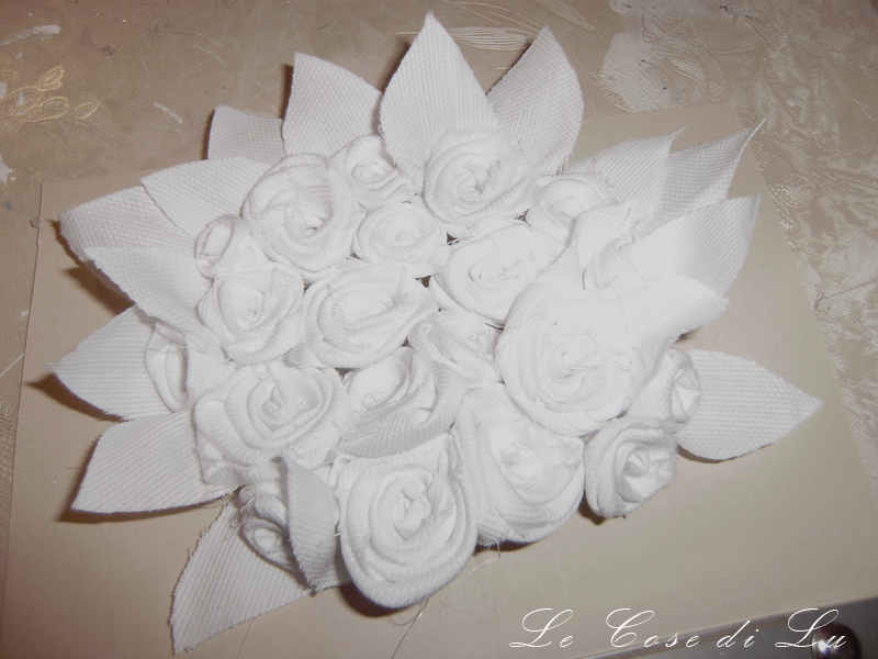 Из плотной ткани (хлопчатобумажная) делаем розы и вырезаем лепестки. Объединяем все детали в букете горячим клеем.